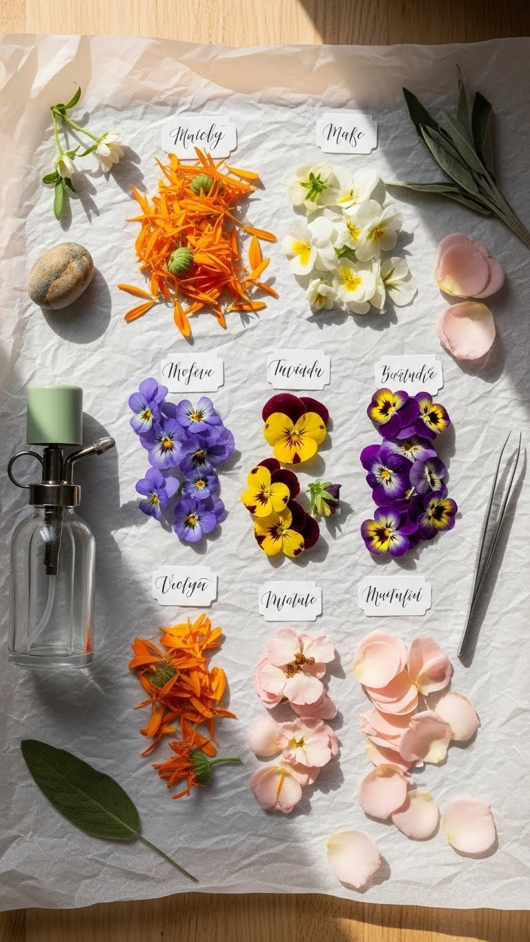 - Pansies, violas, marigolds (calendula), nasturtiums, rose petals, lavender buds.