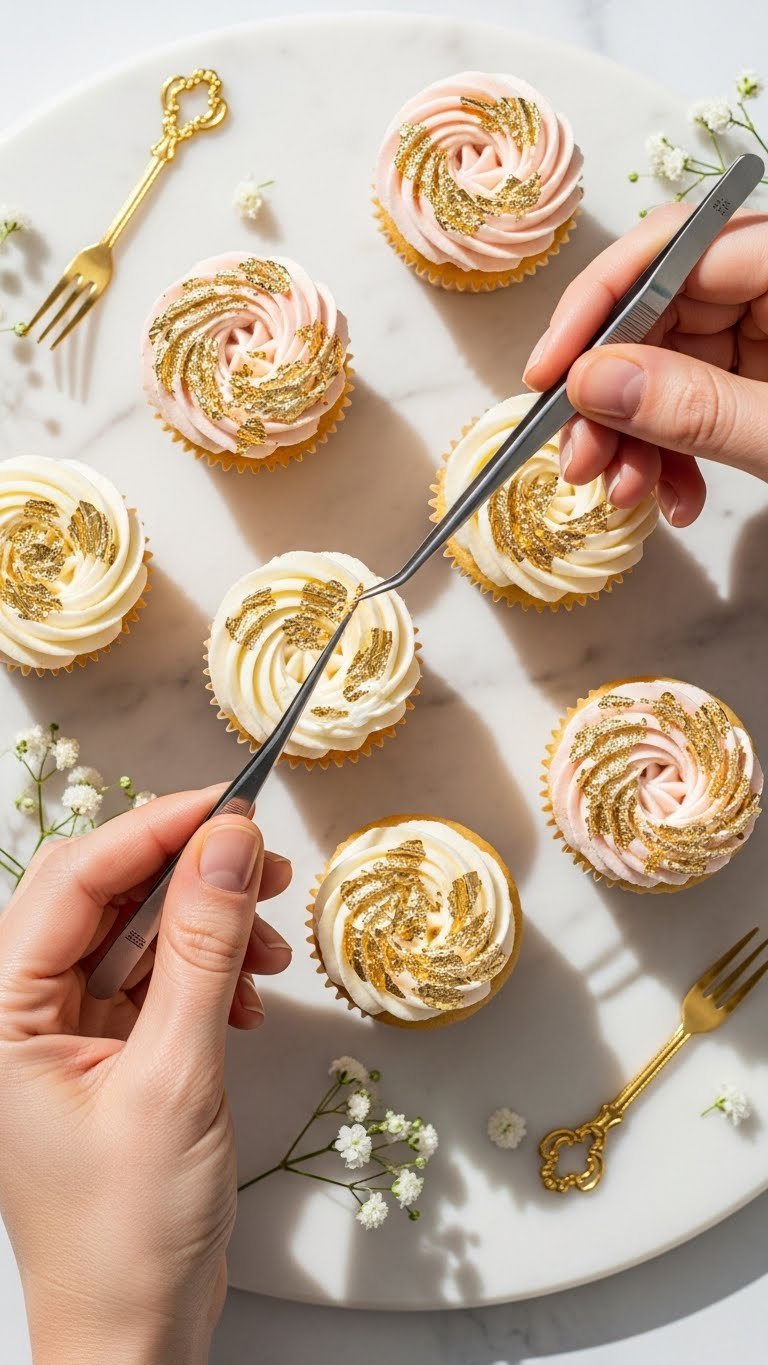 Start with cupcakes that are fully cooled. If frosting is too soft, chill for 10–15 minutes to firm it up. You want a stable surface so gold leaf doesn’t sink or tear.