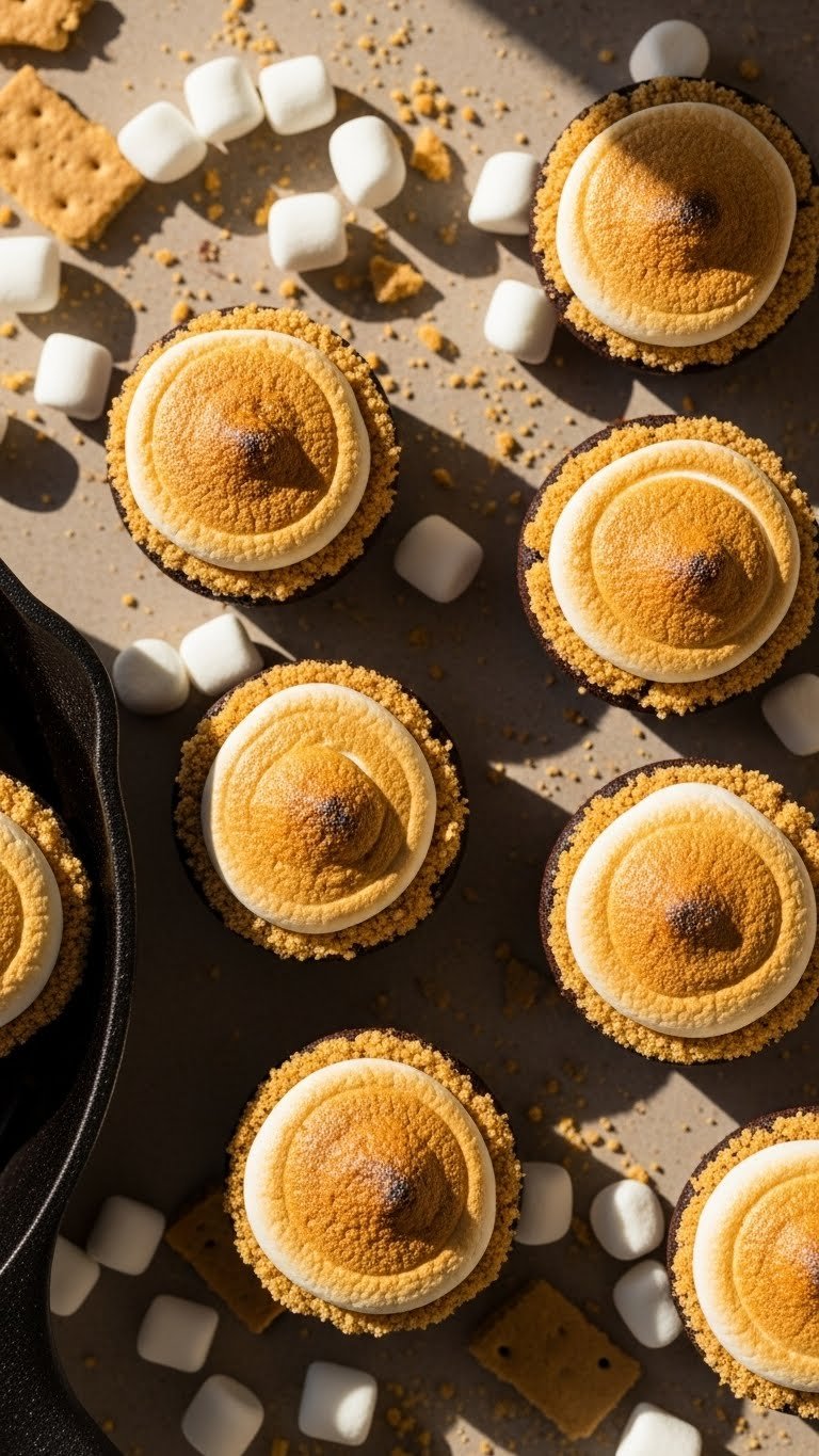 These bites compress s'mores into fudgy brownie cups topped with toasted marshmallow frosting. The smoky marshmallow and crumbly graham pair perfectly with dense chocolate.