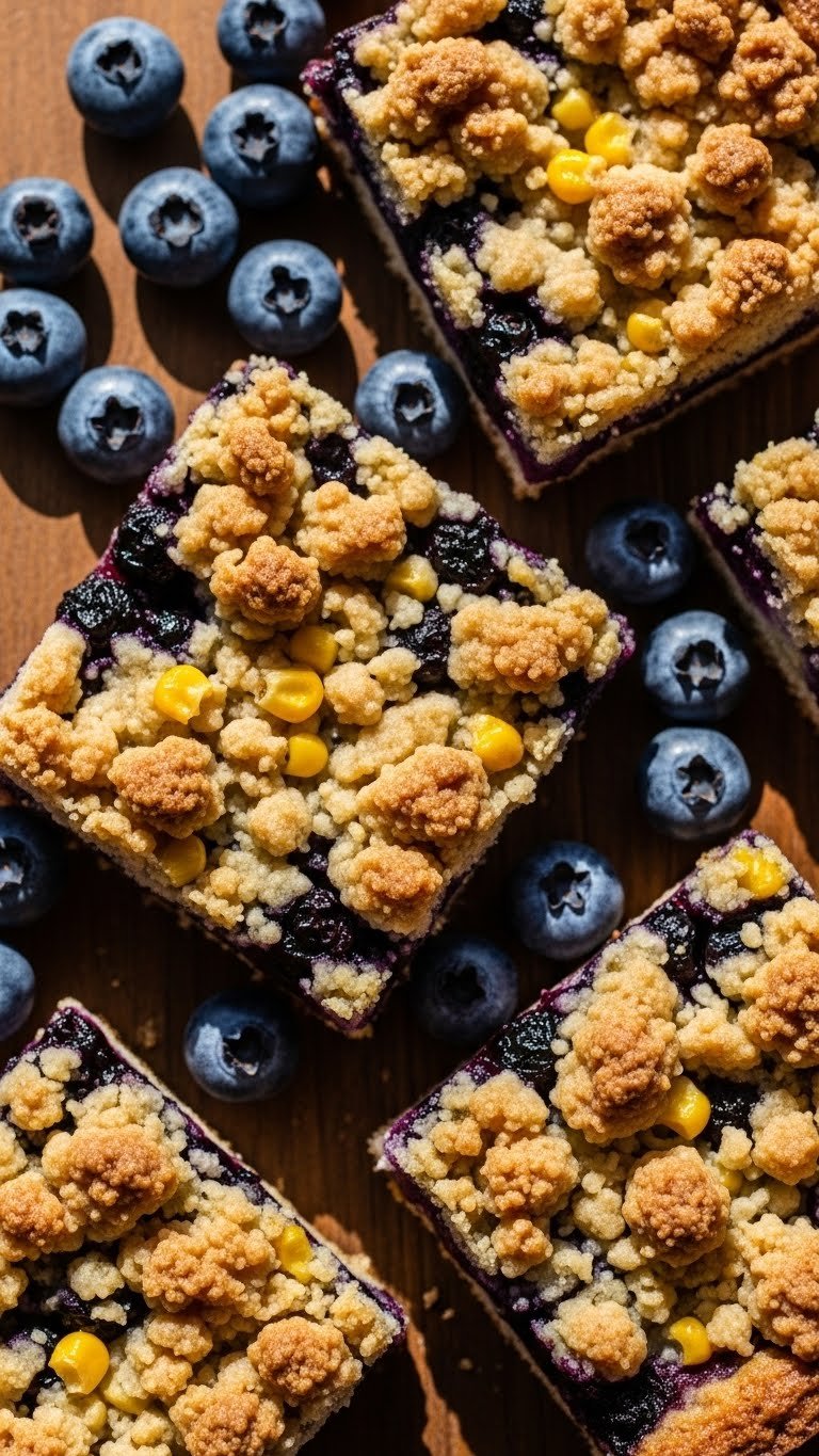 Savory-sweet corn kernels add texture and a summer note to classic blueberry crumble bars. The grilled corn adds a subtle smoky twist that ties to the BBQ theme.