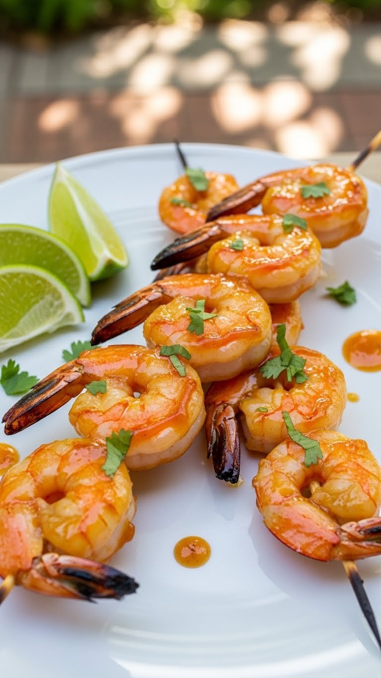 Serve skewers on a bright platter with lime wedges. Pair with chilled white wine or a fruity mocktail. Make sauce ahead; toss shrimp just before grilling. Leftovers work well in salads. Perfect for spring or summer showers.