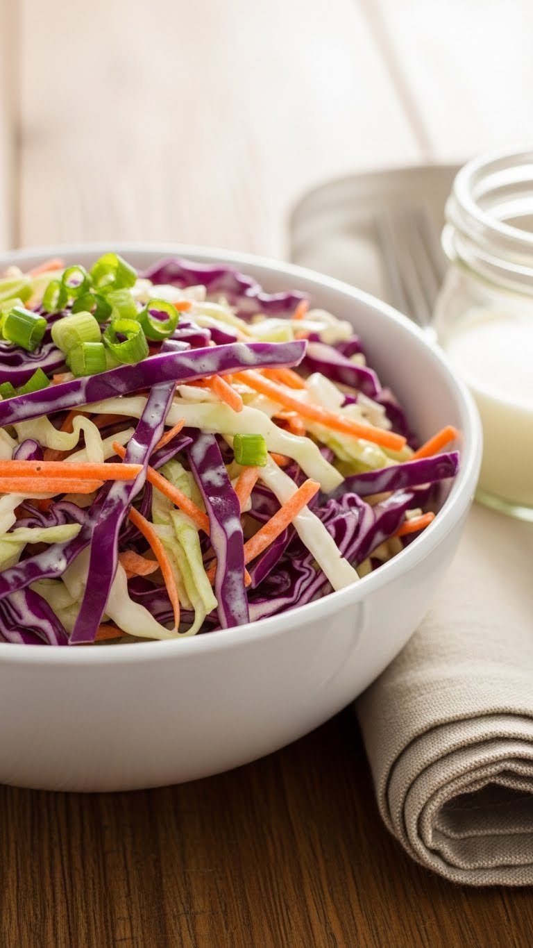 - Give the coleslaw a final toss before serving. If too thick, stir in 1–2 tablespoons of milk.