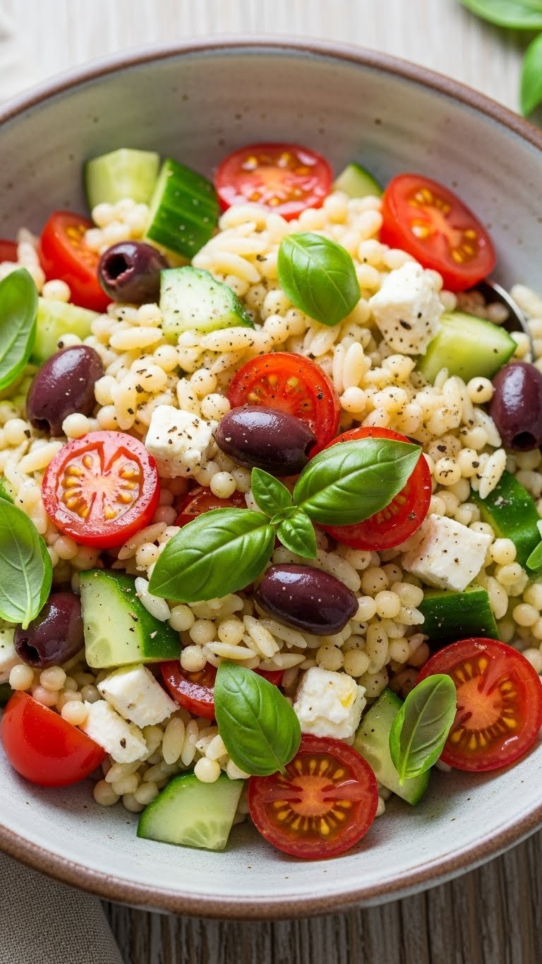 This orzo salad is bright, herb-forward, and light. Tomatoes, cucumber, olives, and feta add Mediterranean notes. Olive oil and lemon bring it together.