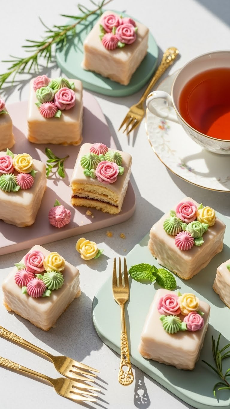 These petit fours are tiny canvases for Baby Bloom Buttercream Designs. Each petite square has sponge, jam, and a thin buttercream coat. The flavor is almond-vanilla with a tangy jam layer. They’re elegant finger desserts for tea parties and baby showers. You’ll enjoy piping dozens of tiny flowers and watching the table fill with color.