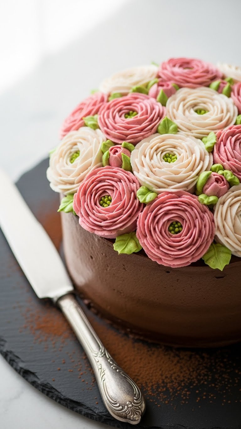 Serve on a dark slate or white plate for contrast. Dust with a light cocoa or powdered sugar for a finishing touch. Pair with espresso or a rich dessert wine. Store in the fridge, and decorate no more than one day ahead. Chocolate ranunculus cakes are lovely for cooler-season parties.