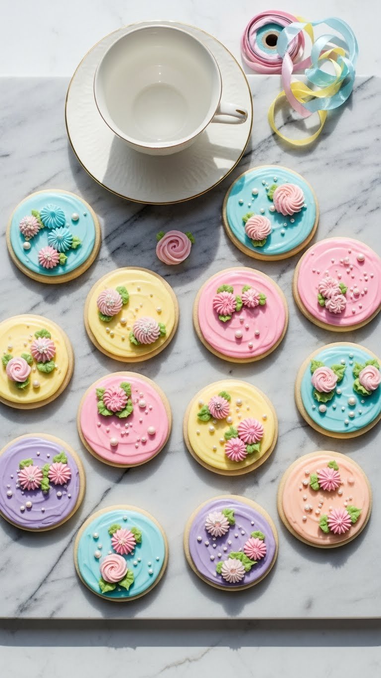 Wrap individually in cellophane and tie with ribbon for favors. Match cookie colors to party palette and place at each guest seat. Pair with tea or sparkling water. Cookies keep well in a covered tin; avoid stacking until buttercream sets. Make cookies two days ahead and pipe buttercream on party morning for best texture.
