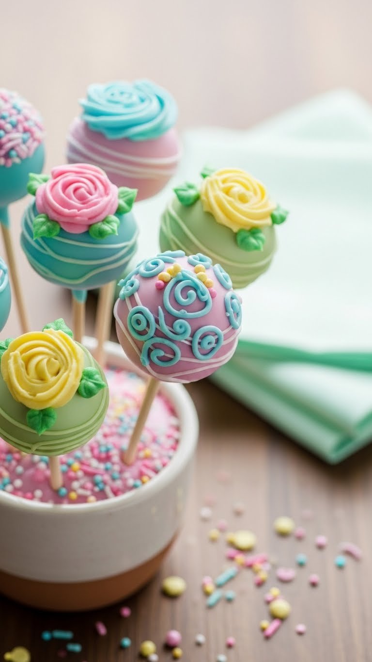 - Pipe small petal clusters or rosettes on top of each cake pop. Chill briefly to set.