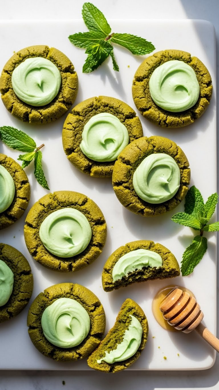 Serve on a dark slate to contrast green color. Garnish with small mint sprigs or a dusting of matcha. Pair with matcha latte or sparkling water. Store airtight for 3 days. Freeze uniced cookies for 1 month.