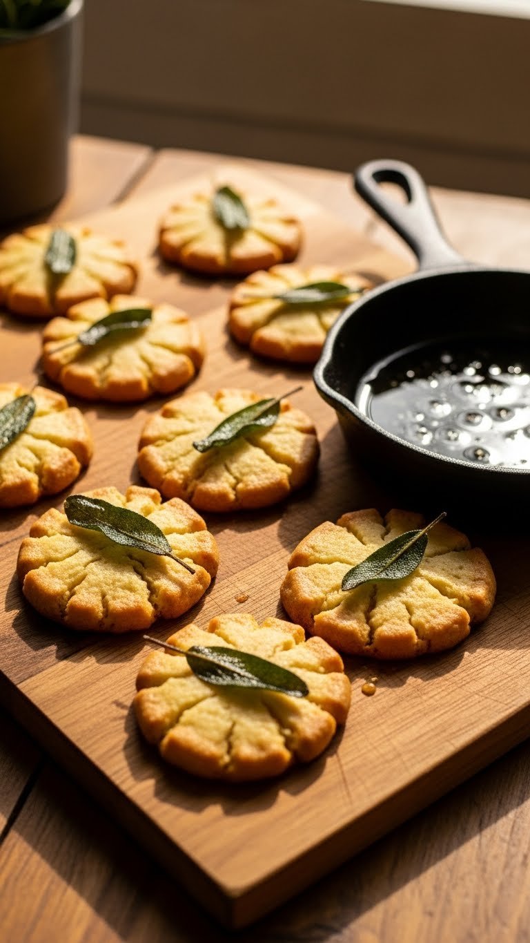 Arrange with small bowls of maple butter or ricotta. Pair with a lightly sweet cider or herbal tea. Garnish with extra fried sage for drama. Make ahead: bake and freeze, then thaw before serving.