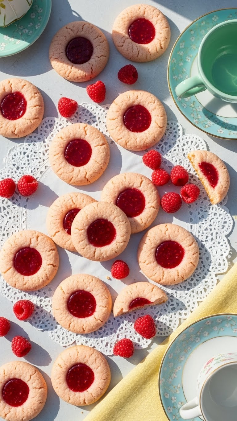 Serve on a tiered platter with extra jam jars for refills. Pair with black tea or a lemony sparkling drink. Store airtight for 3 days at room temperature. Make ahead: freeze baked, unfilled cookies and add jam after thawing.