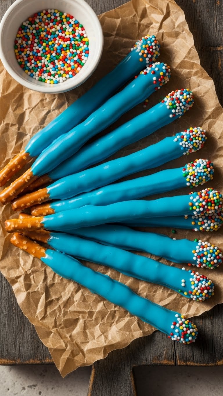These blue candy pretzel sticks balance salty crunch with sweet coating. They’re simple to make and great for casual showers or snack tables. The contrast of salt and sugar makes them addictive. You’ll love the crisp snap and glossy candy sheen.