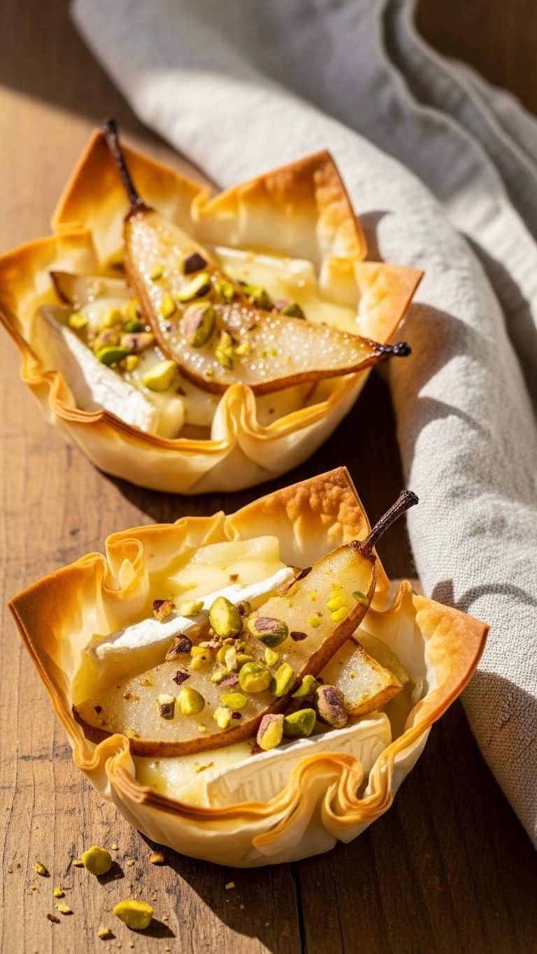 These phyllo bites pair warm brie with spiced pears and crunchy pistachios. The texture is crisp shell and gooey cheese. They feel cozy and refined, ideal for a boho baby shower with autumnal touches. Guests who enjoy sweet-savory combinations will love them. The scent is honeyed pear and melted cheese.