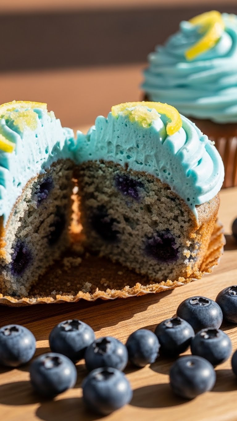 - Garnish each cupcake with one blueberry and a tiny lemon twist.
