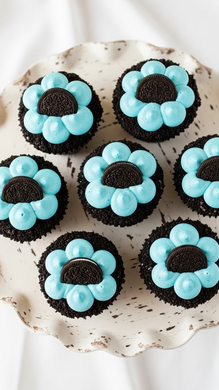 These Oreo cloud baby boy cupcakes are playful and nostalgic. Crushed cookies in the batter give gentle crunch. The cloud-like frosting is airy and light blue. They’re perfect if you want something familiar with a cute baby-boy look. Kids and cookie lovers will adore them.