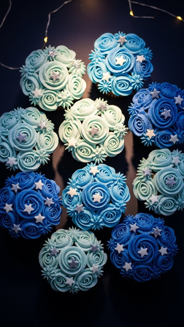 These twinkle star baby boy cupcakes sparkle with tiny fondant stars and shimmer. The cake is a soft vanilla with a light crumb. Multiple blue frosting shades create a celestial gradient. They match a starry-night baby shower theme. You’ll love the glittering presentation.