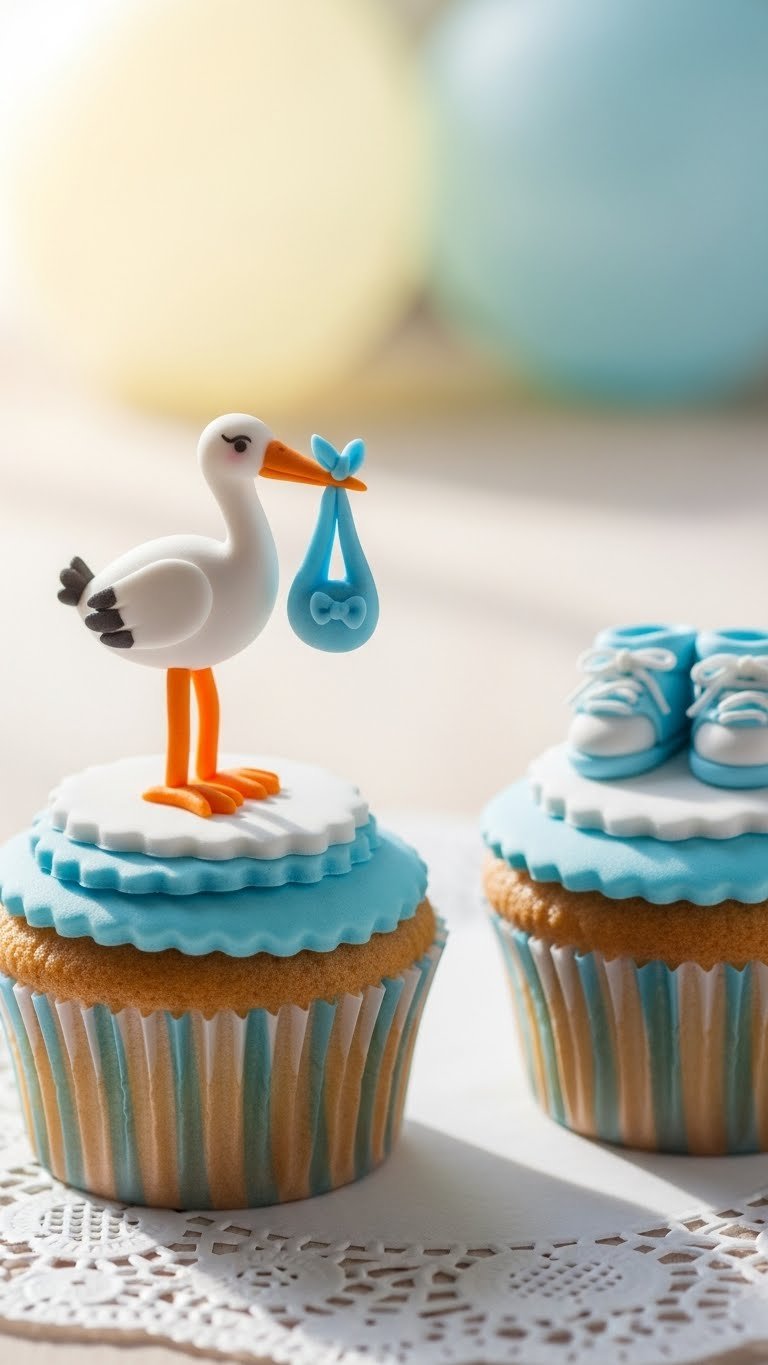 These stork & booties baby boy cupcakes are whimsical and show-ready. Vanilla cupcakes topped with light blue buttercream hold charming fondant storks and booties. The tiny details make each cupcake feel handmade and celebratory. They’re great if you want keepsake-worthy photo props.