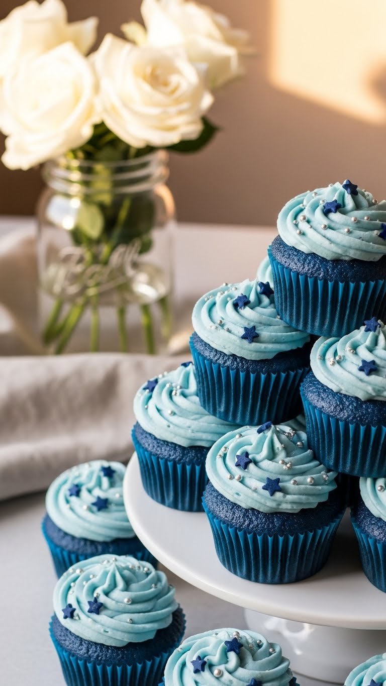 These blue velvet cupcakes are soft, moist, and subtly cocoa-sweet with a showy pale-blue buttercream swirl. The crumb is tender, slightly tangy from buttermilk. They’re perfect for a baby boy dessert table ideas theme because they’re cute stacked and easy to pick up.