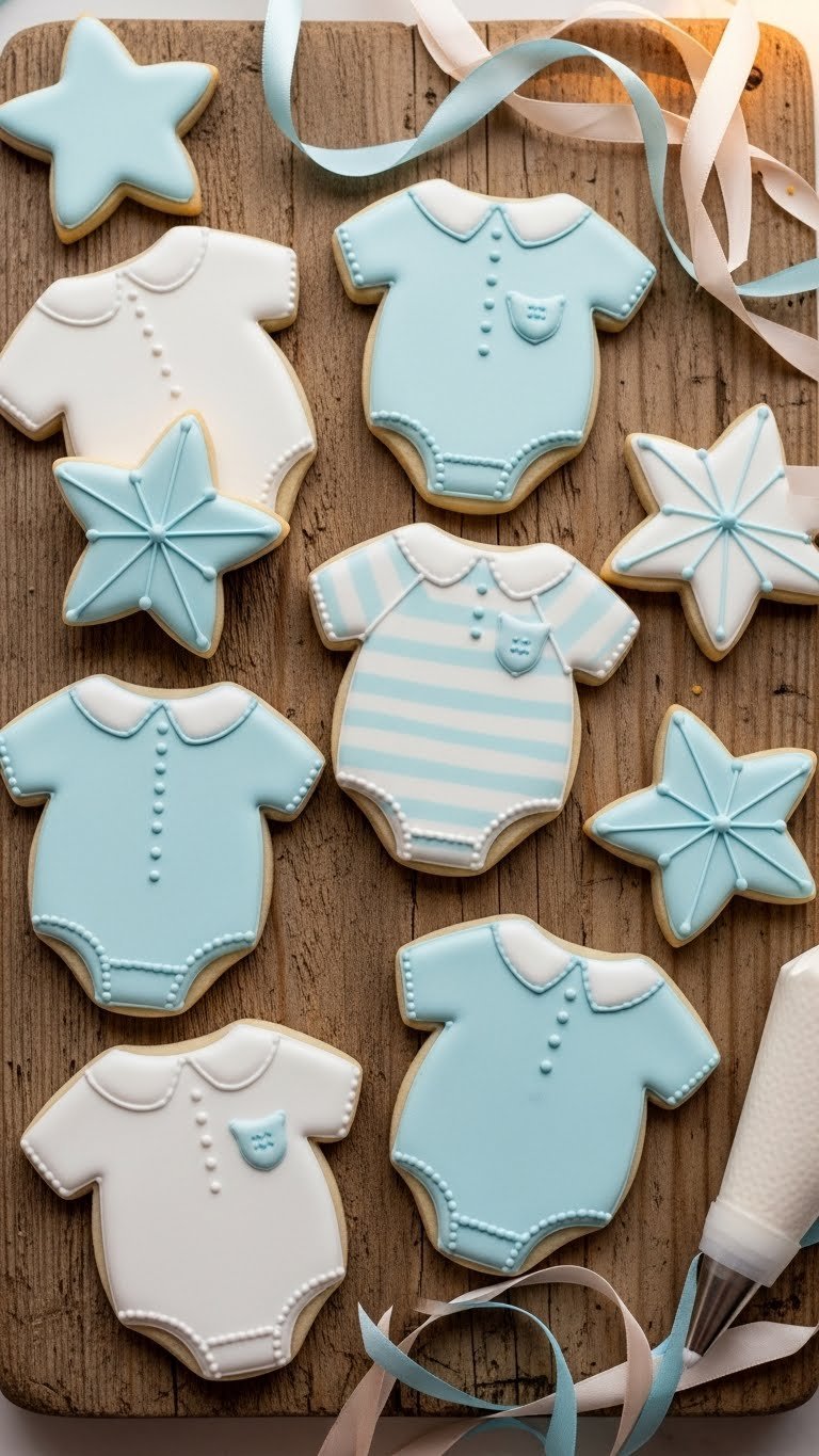 Soft, buttery sugar cookies iced in baby-blue royal icing make a charming addition to a baby boy dessert table. Texture is tender with a slight snap at the edge, and the icing dries to a crisp finish perfect for stacking or wrapping.