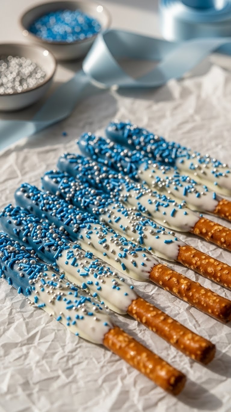 4. Chocolate-Dipped Pretzel Rods with Blue Sprinkles