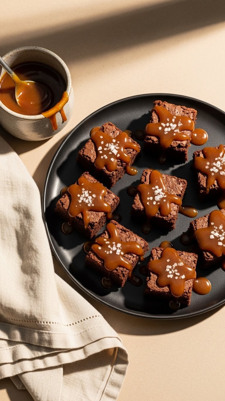 Serve on a slate platter with small forks. Garnish with a light dusting of cocoa or a miniature blue fondant star. Pair with cold milk or coffee. Store in an airtight container at room temp 2 days, or refrigerate up to 5 days. Make brownies a day ahead and add caramel just before serving for best texture.