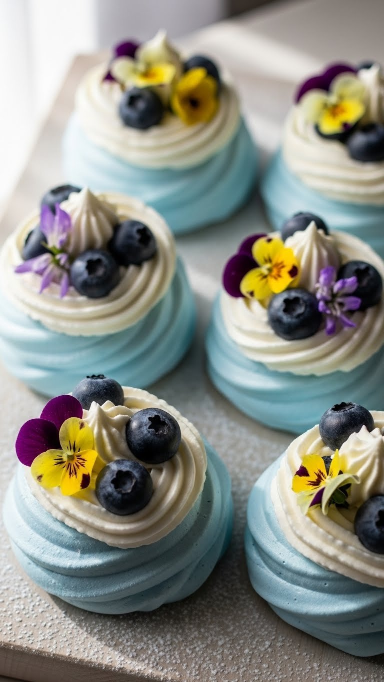 - Fill cooled nests with cream and top with blueberries and edible flowers just before serving.
