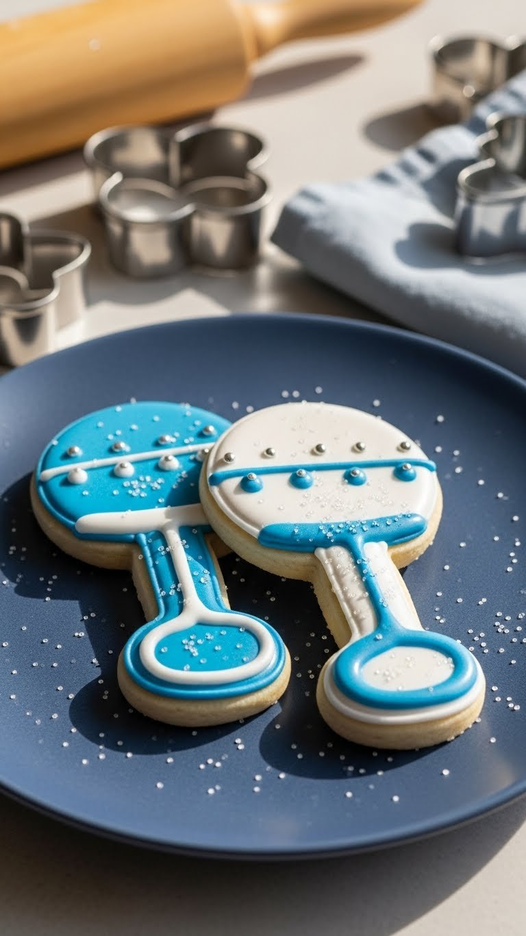 These classic sugar rattle cookies stand out with crisp edges and glossy royal-iced tops. They taste buttery with a hint of vanilla and a tender snap. The rattle shape fits the baby-boy theme and looks charming on dessert tables. You’ll love making them for showers, favor bags, or a sweet gift. The smell of butter and vanilla while they bake is practically nostalgic.