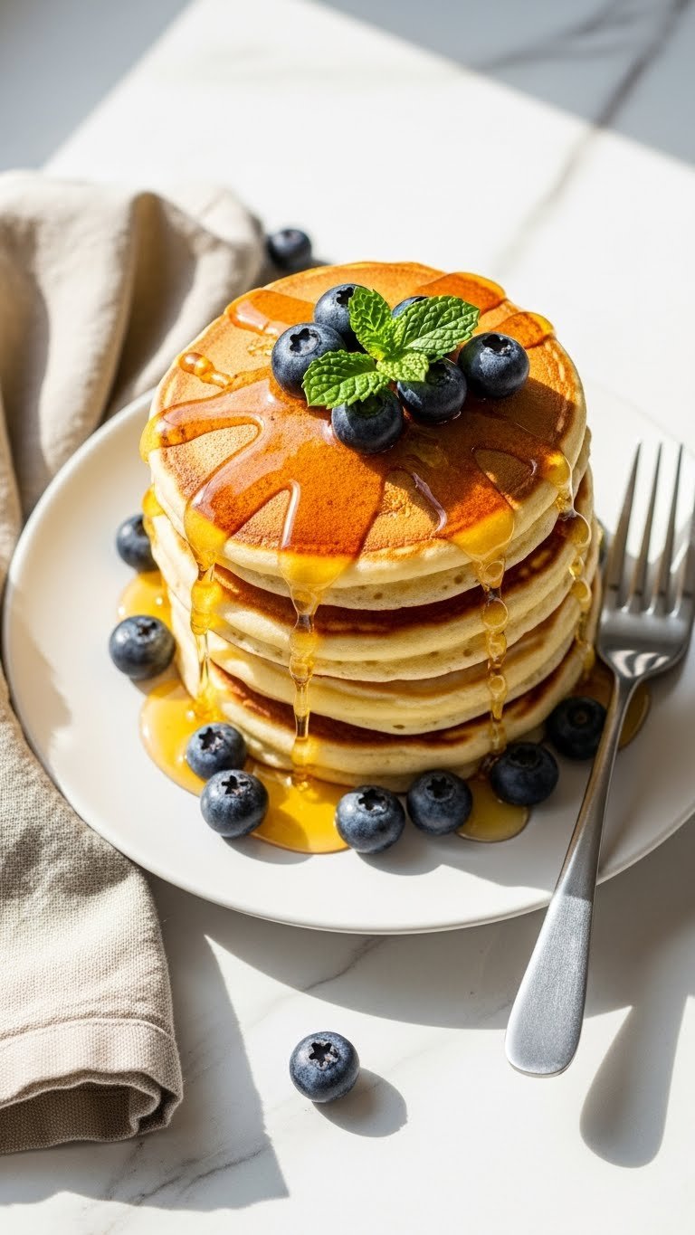 Serve stacks on white plates for contrast. Garnish with fresh blueberries, a lemon twist, and a sprig of mint. Pair with fresh coffee, herbal tea, or chilled mimosas. Store leftovers covered in the fridge up to 2 days; reheat on a skillet. Make-ahead tip: prepare batter and refrigerate for up to 8 hours. This bright stack suits spring and garden-themed brunches.