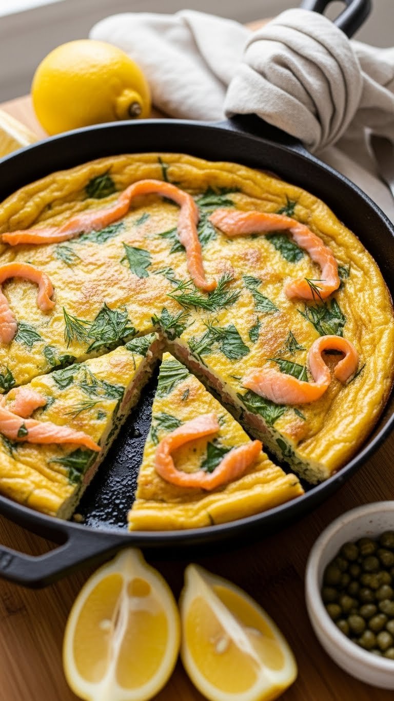 Slice wedges and serve directly from the skillet or transfer to a platter. Top with a sprinkle of extra dill and a lemon wedge. Pair with toasted bagels, sliced cucumber, and a crisp white wine or iced tea. Refrigerate leftovers for up to 3 days; reheat gently in a low oven. Make it ahead: prepare filling and egg mix separately and bake the morning of.