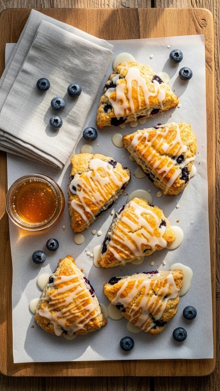 - Stack pancakes and drizzle with honey. Add blueberries and extra lemon zest.