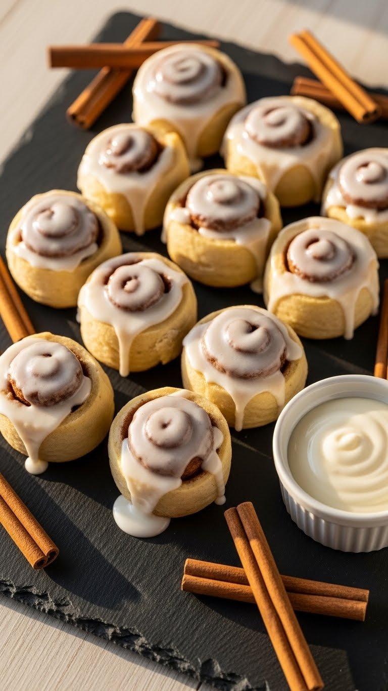 Arrange bites on a pretty platter with the cream cheese dip in a small bowl. Garnish with a dusting of cinnamon and a few pecan halves. Pair with strong coffee, chai, or a caramel latte. Store in an airtight container at room temperature for 1 day or refrigerate for 3 days. Rewarm briefly in the oven before serving.