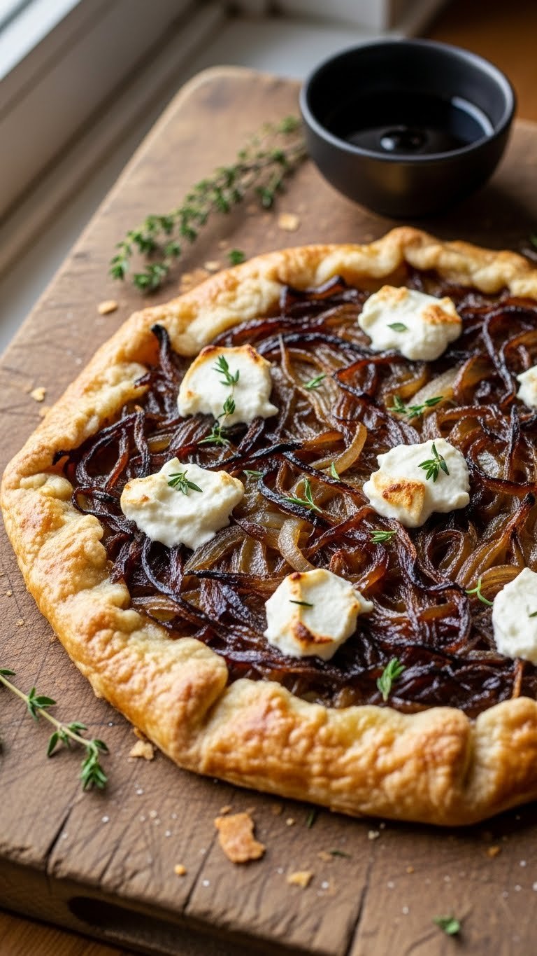 Cut into squares or slices and serve warm. Drizzle with extra balsamic reduction and garnish with thyme sprigs. Pair with arugula salad and a crisp white wine. Store leftovers in the fridge for 3 days; reheat in a low oven. Make-ahead: caramelize onions up to 2 days ahead.