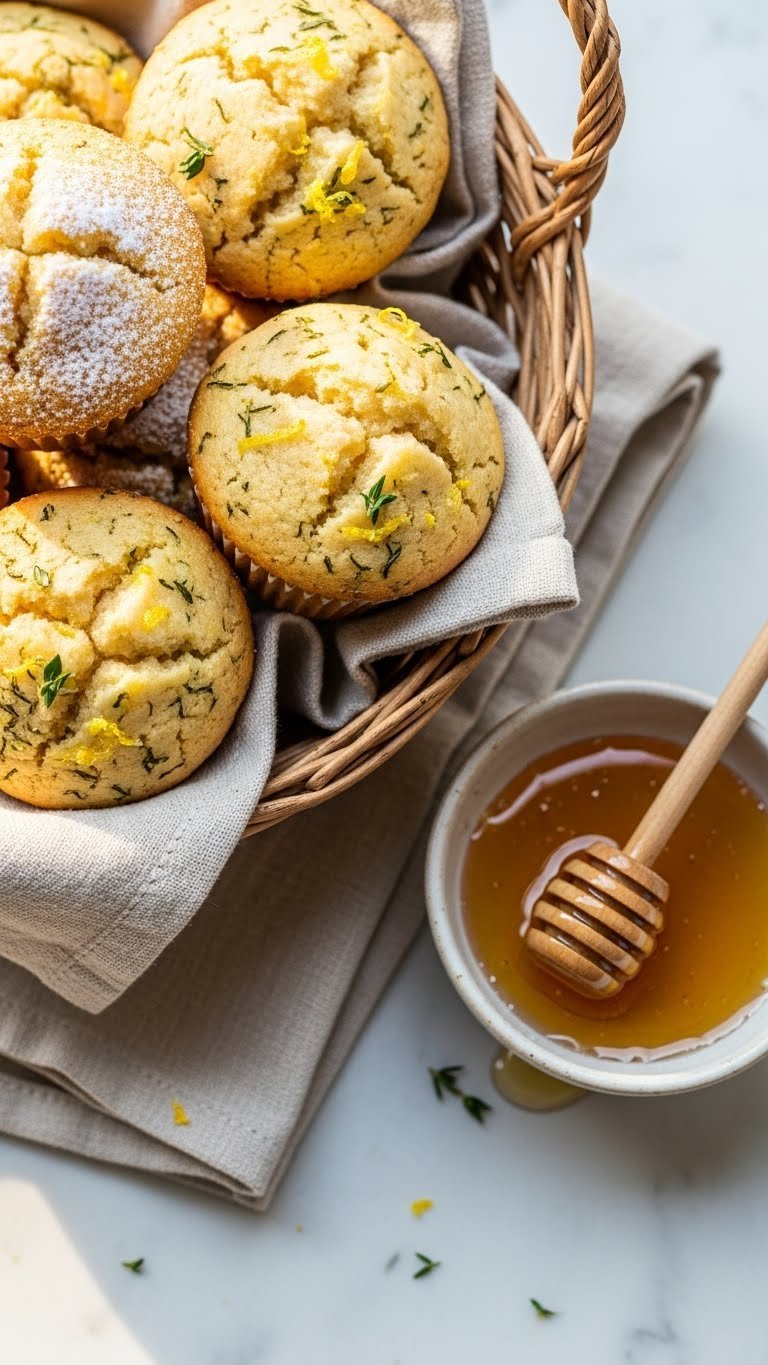 Serve muffins in a basket with butter and honey. Garnish with lemon slices and herb sprigs. Pair with coffee, tea, or a citrusy mocktail. Store in an airtight container for 2 days or freeze for up to 1 month. Make-ahead: bake the day before and warm briefly before serving.