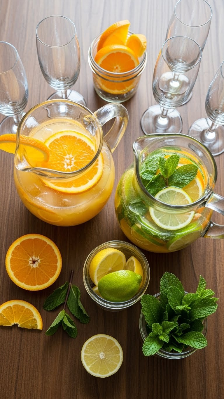 Place pitchers on a drinks table with labels and garnish bowls. Offer Champagne flutes and non-alcoholic glasses. Add pretty straws and citrus wheels for flair. Store citrus punch chilled and make mimosas on arrival for best fizz. Make-ahead: prepare juice mixes and chill; add sparkling elements at service time.