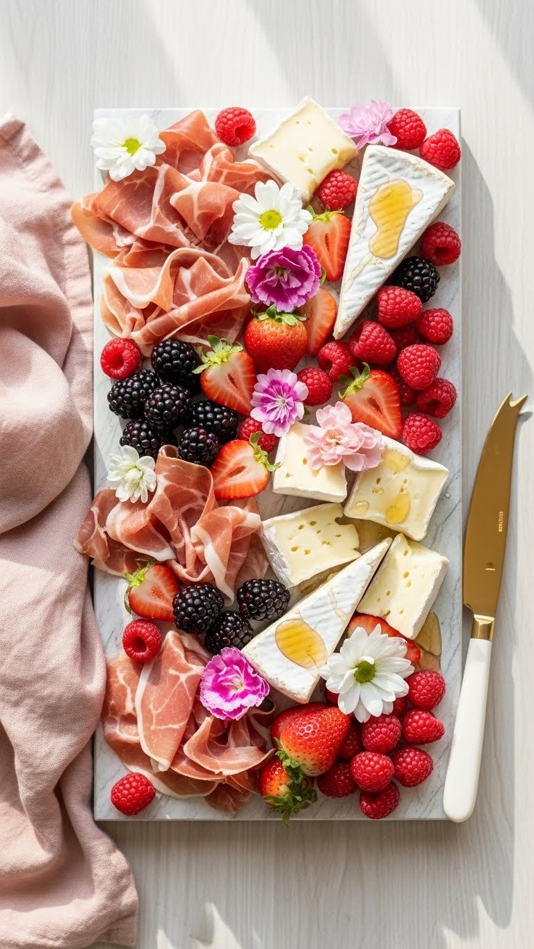This Blush & Berries bridal shower charcuterie board pairs creamy cheese with bright berries and floral accents. The mix of soft brie, tangy goat cheese, and salty prosciutto creates balanced bites. Fresh berries add sweetness and vivid color for a romantic feel. It’s perfect for bridal showers with a soft color palette and anyone who loves sweet-savory contrasts. Expect juicy berries, velvety cheese, and a honeyed finish.