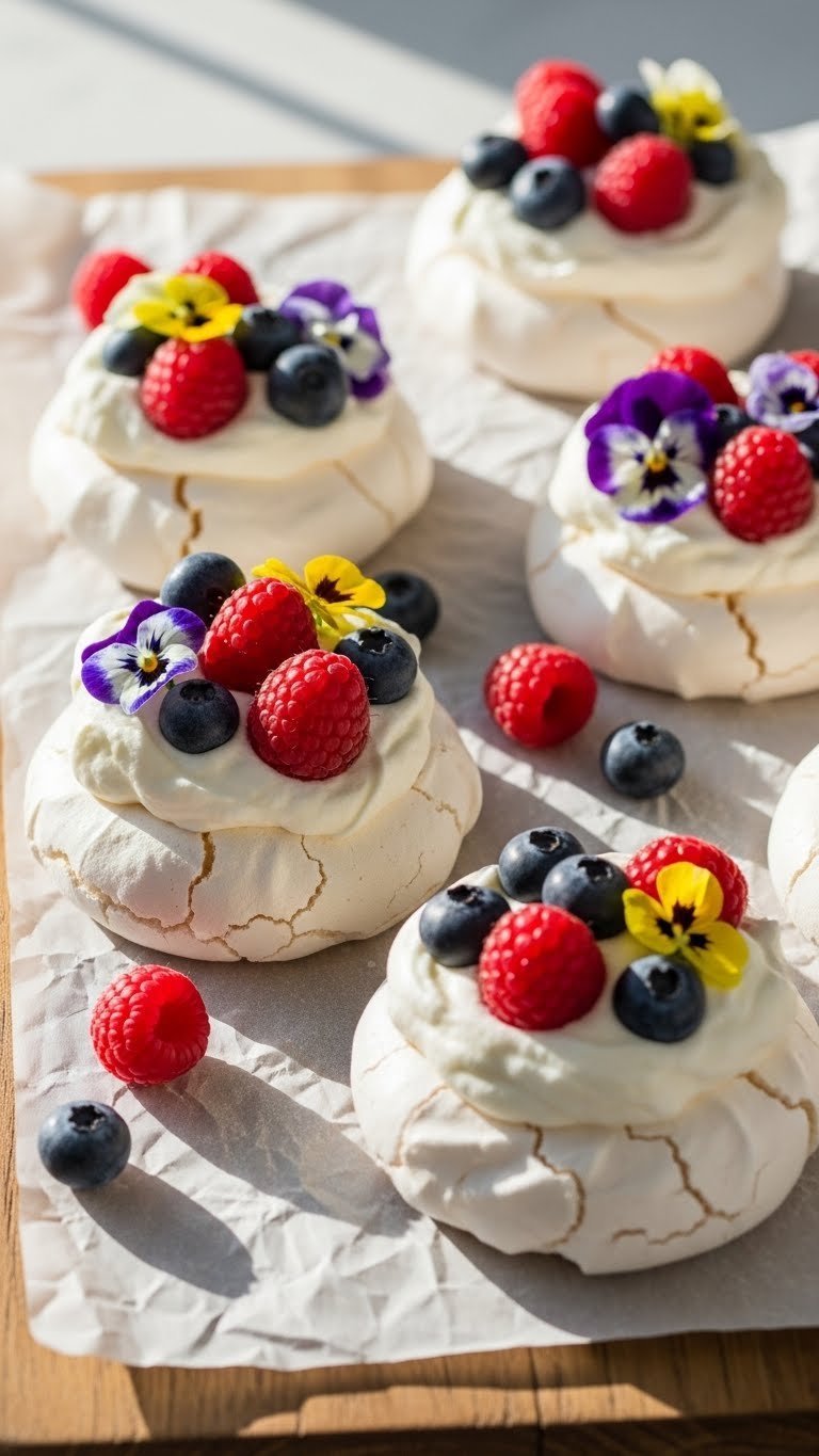 Mini pavlovas are crisp outside, marshmallow-soft inside, and topped with fresh cream. They feel light and elegant on a dessert bar. The bright berries and flowers make a gorgeous presentation.
