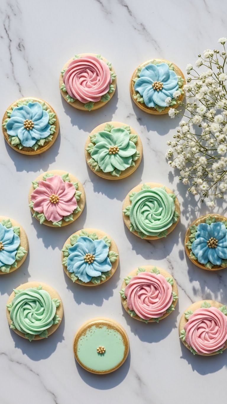 - Pipe outlines, let set slightly, then flood with thinner icing. Add piped flowers and edible blooms.