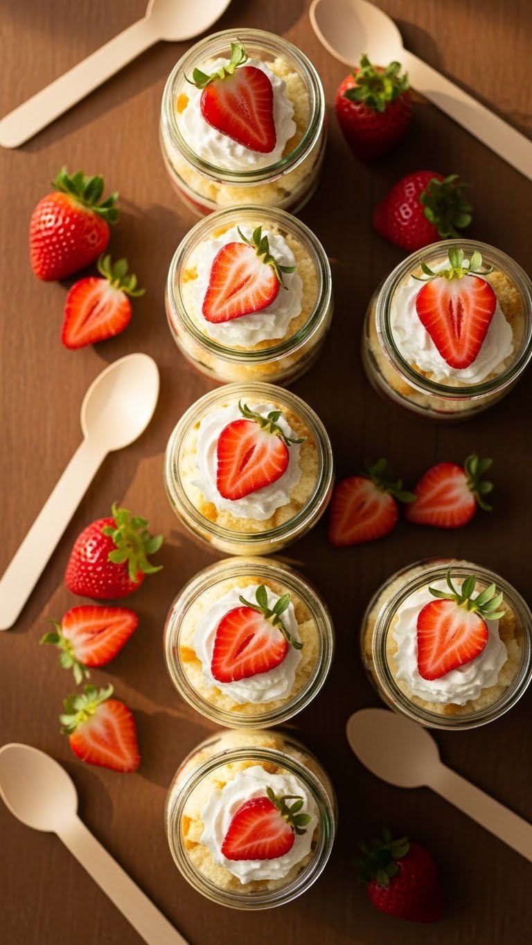 - Spoon a layer of cake into jars, add whipped cream, then strawberries.