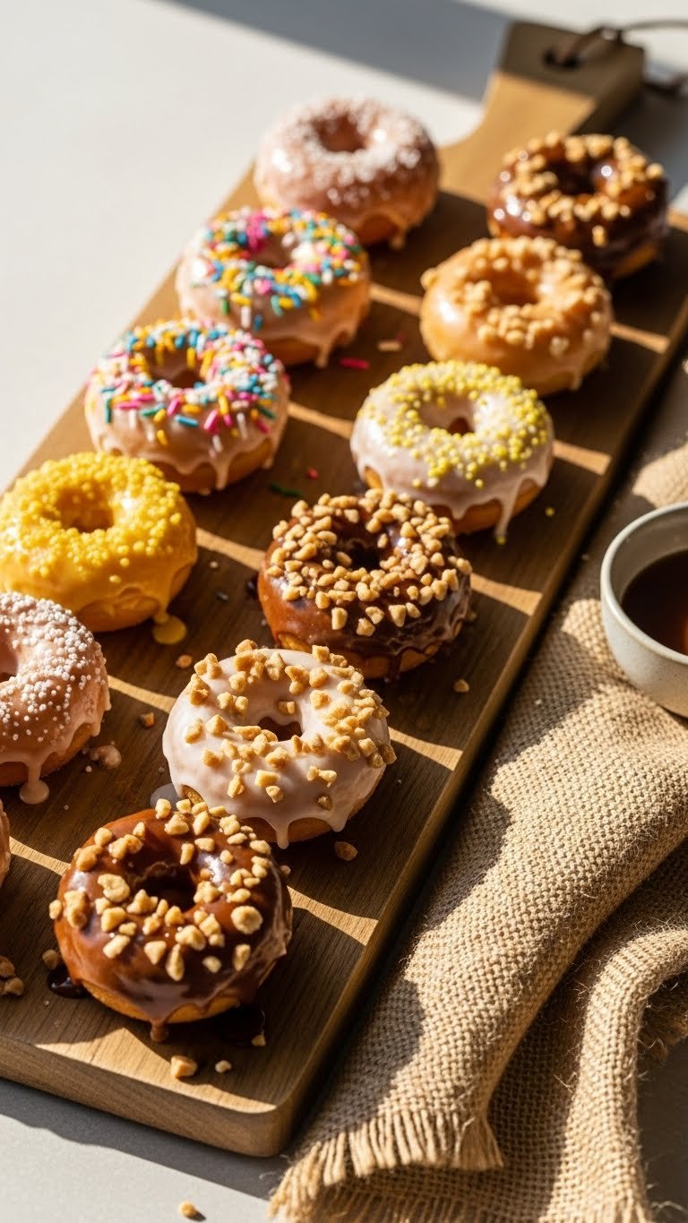 Display on a tiered donut stand or peg wall. Offer labels for flavors and small plates. Pair with coffee, latte, or cider. Store glazed donuts in an airtight container up to 2 days; best eaten fresh. You can bake dough the day before and glaze on event day.