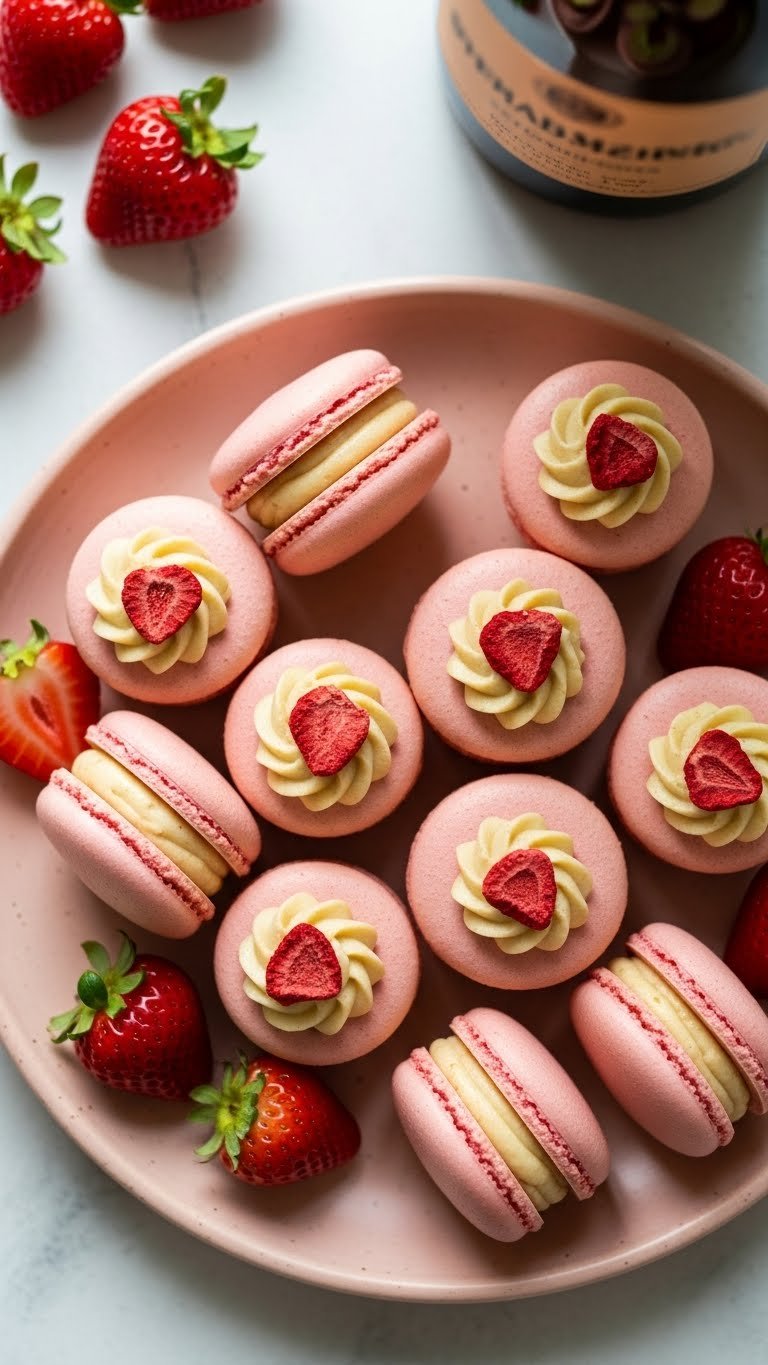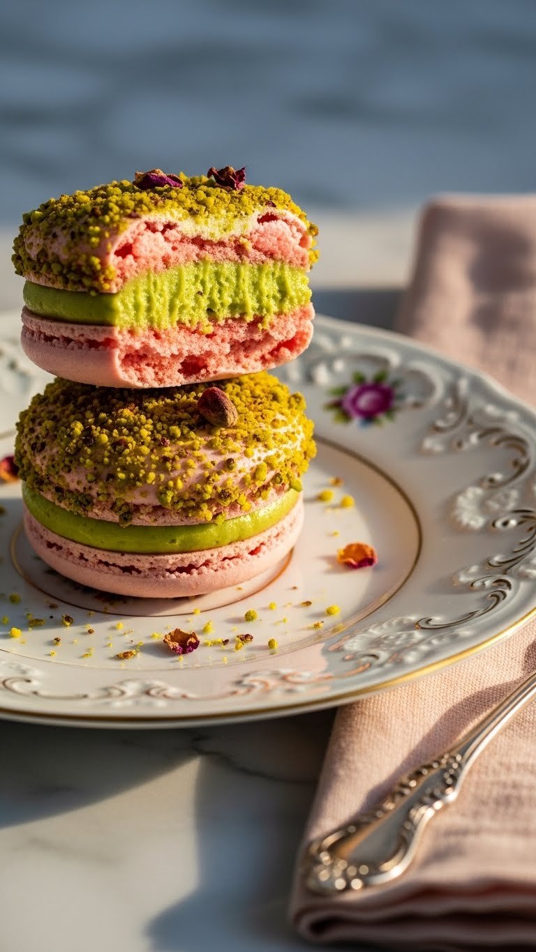 Present on a tiered dessert stand with fresh rose sprigs. Garnish each macaron with a sprinkling of crushed pistachio. Pair with chilled champagne or rose tea. Store in an airtight container in the fridge up to 4 days. Bring to room temperature 20–30 minutes before serving. Make shells a day ahead; fill the day of for best texture.