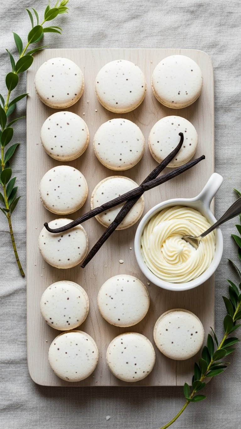 Classic Vanilla Bean Bridal Shower Macarons showcase pure vanilla flavor. The shells are creamy with tiny black specks of vanilla. The vanilla buttercream is silky and not too sweet. These macarons are timeless for bridal showers with neutral palettes. Anyone who prefers classic, understated sweets will adore them.