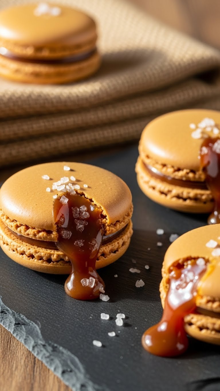 - Pair shells. Pipe ~12 g caramel onto shells and sprinkle a tiny pinch of sea salt on each. Sandwich and chill 30 minutes.