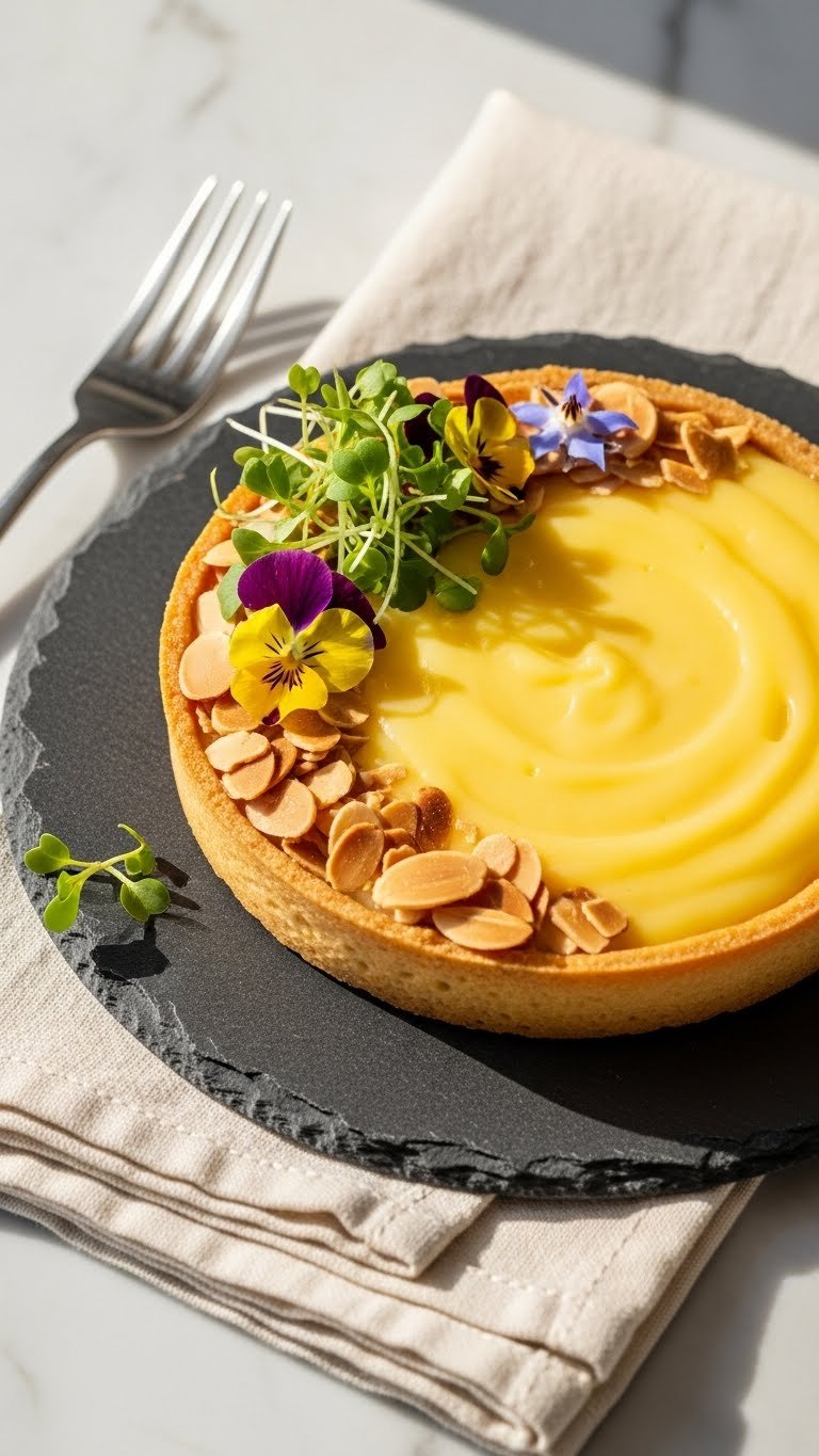 - Garnish with thin lemon zest curls, toasted almonds, and fresh edible flowers.