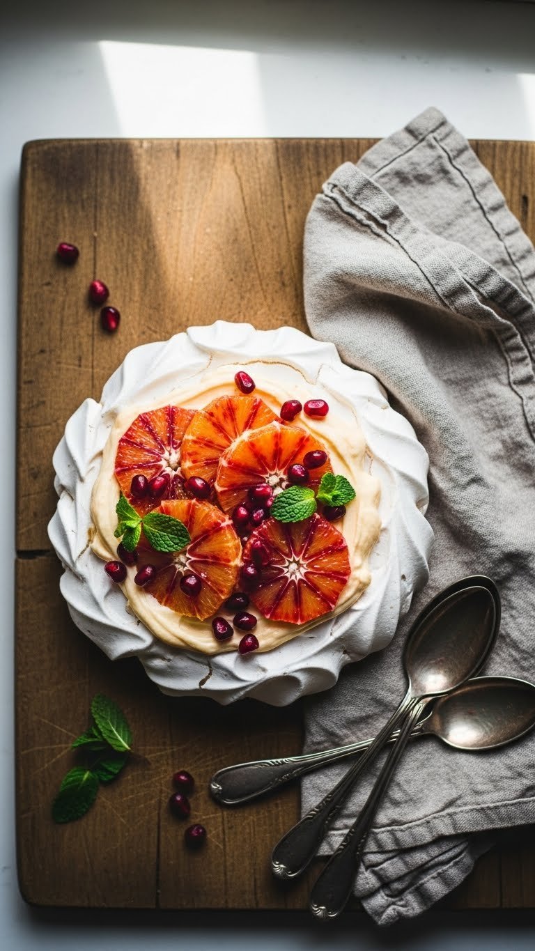 - Spoon mascarpone cream into meringue well. Top with blood orange segments, zest, and pomegranate seeds.