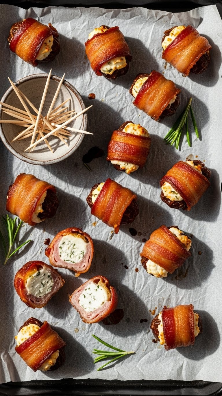 Sweet, salty, and creamy, these Bacon-Wrapped Dates with Goat Cheese always vanish. Medjool dates stuffed with tangy goat cheese get wrapped in smoky bacon and baked until crisp. Texture plays big here: sticky date, soft cheese, and crunchy bacon.