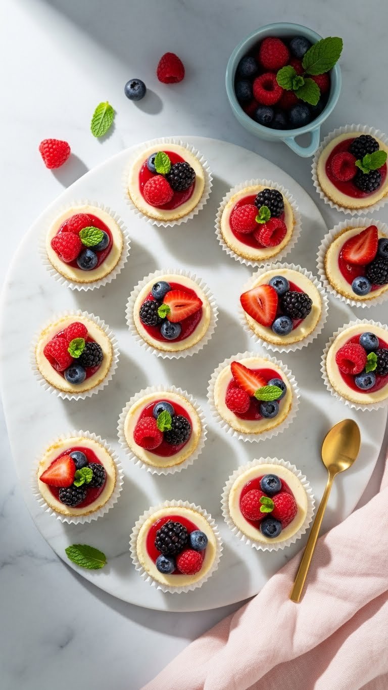 Mini No-Bake Cheesecake Bites are creamy, cool, and easy to make. A crunchy graham base supports a silky cream cheese filling and bright berry topping. They’re bite-sized and sweet without heavy baking.