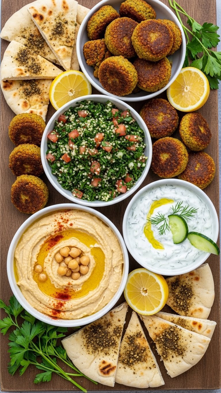 - Arrange hummus, tzatziki, tabbouleh, falafel, pita, and parsley on a large board.