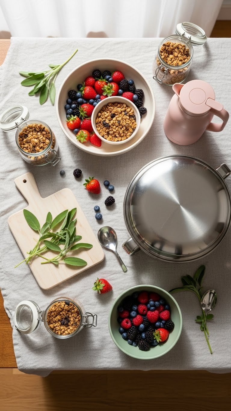 - 1–2 days before: bake pastries, make granola, chop fruit.