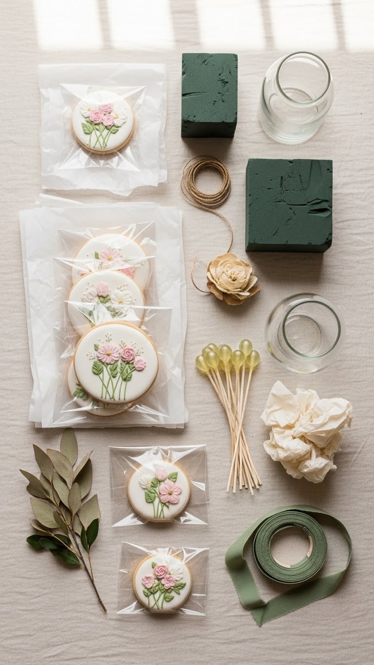 Gathering the right supplies saves time. For one medium bouquet plan on 6–10 decorated cookies, plus extras for variety. Choose firm sugar cookies or store-bought decorated cookies that hold a stick well.