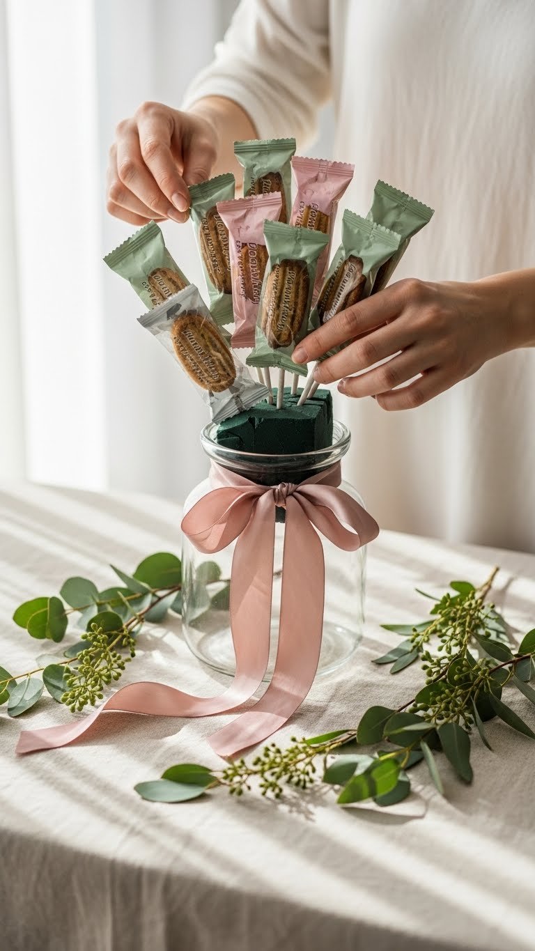 - For broken cookies, wrap fragments and tuck them into the bouquet base as filler.