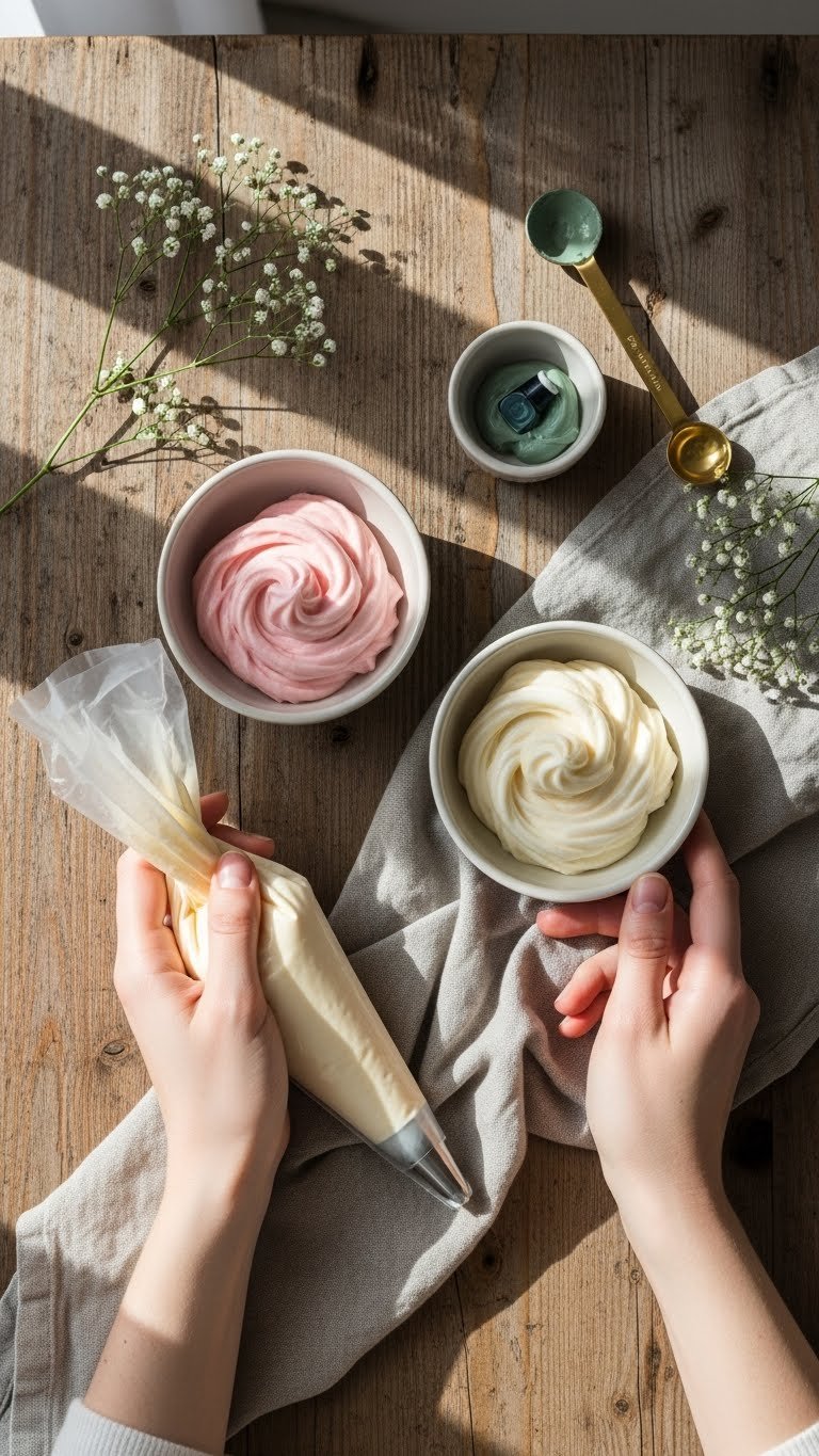 - Color small batches: use gel dyes for sage, soft pink, and cream hues.